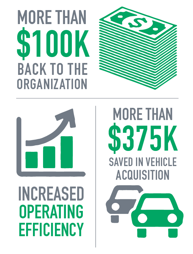 Enterprise provided Clearbrook with a comprehensive fleet program. Through Enterprise’s relationships, Clearbrook was able to secure greater incentives and lower its vehicle acquisition cost. A proactive vehicle replacement plan was developed to better track, control, and budget for the fleet. Maintenance and fuel programs were implemented to monitor and minimize operating expenses. Clearbrook switched to an open-end lease structure to allow flexibility and give equity back to the organization at the end of the lease term.