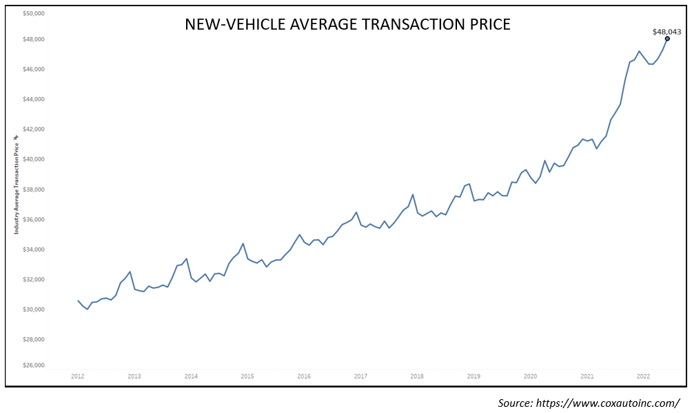 Cox Automotive reported that data released by Kelley Blue Book, a Cox Automotive company, showed June 2022 was the highest mark recorded for the average transaction price for new vehicles. The record price hit over $48,000.